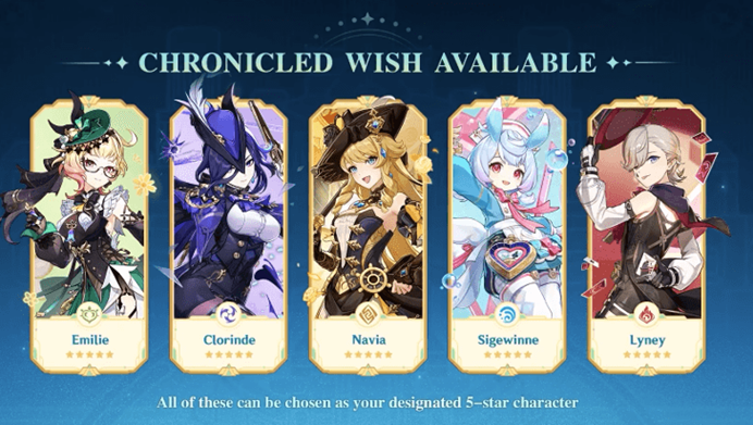 Pada Versi 6.5 Genshin Impact, banner Chronicled Wish kembali hadir dengan fokus pada karakter dan senjata dari region Fontaine.