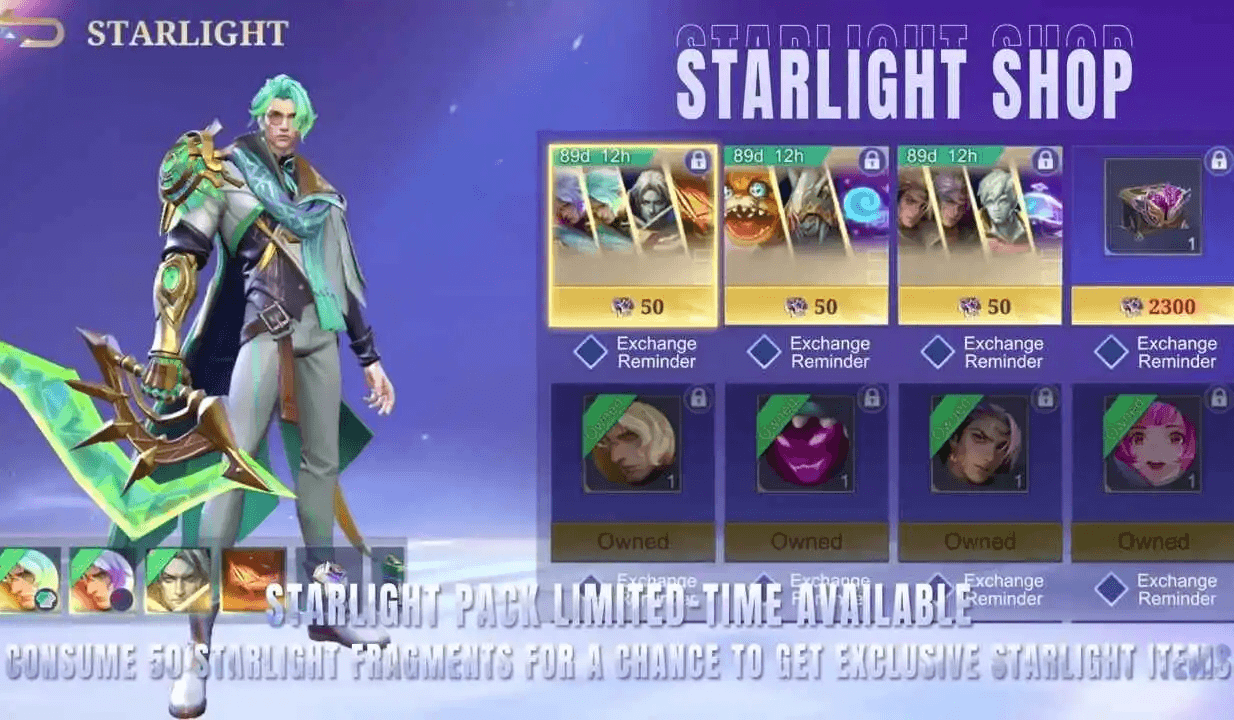 Starlight Shop: Kesempatan buat kamu yang dulu kelewatan skin Starlight incaran! Bulan ini, ada 10 skin Starlight lama yang bisa kamu tukarkan dengan Starlight Fragment. Harga skin Starlight biasa 3000 Fragment dan skin Starlight Tahunan 5000 Fragment.